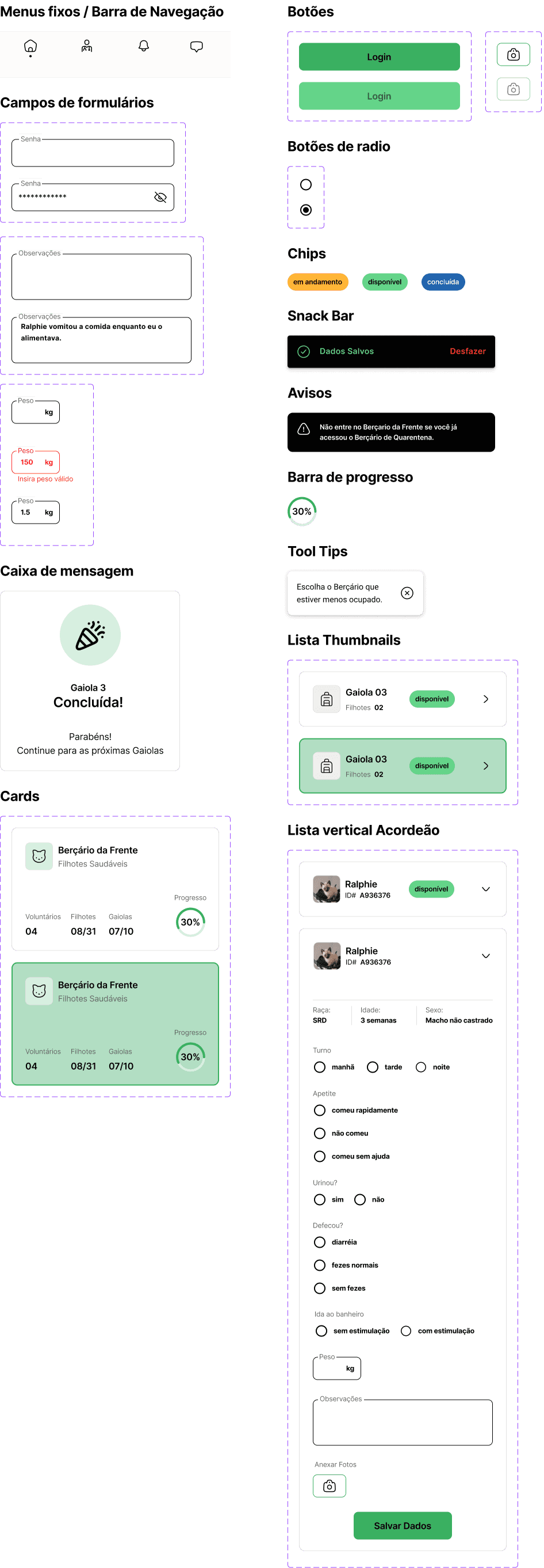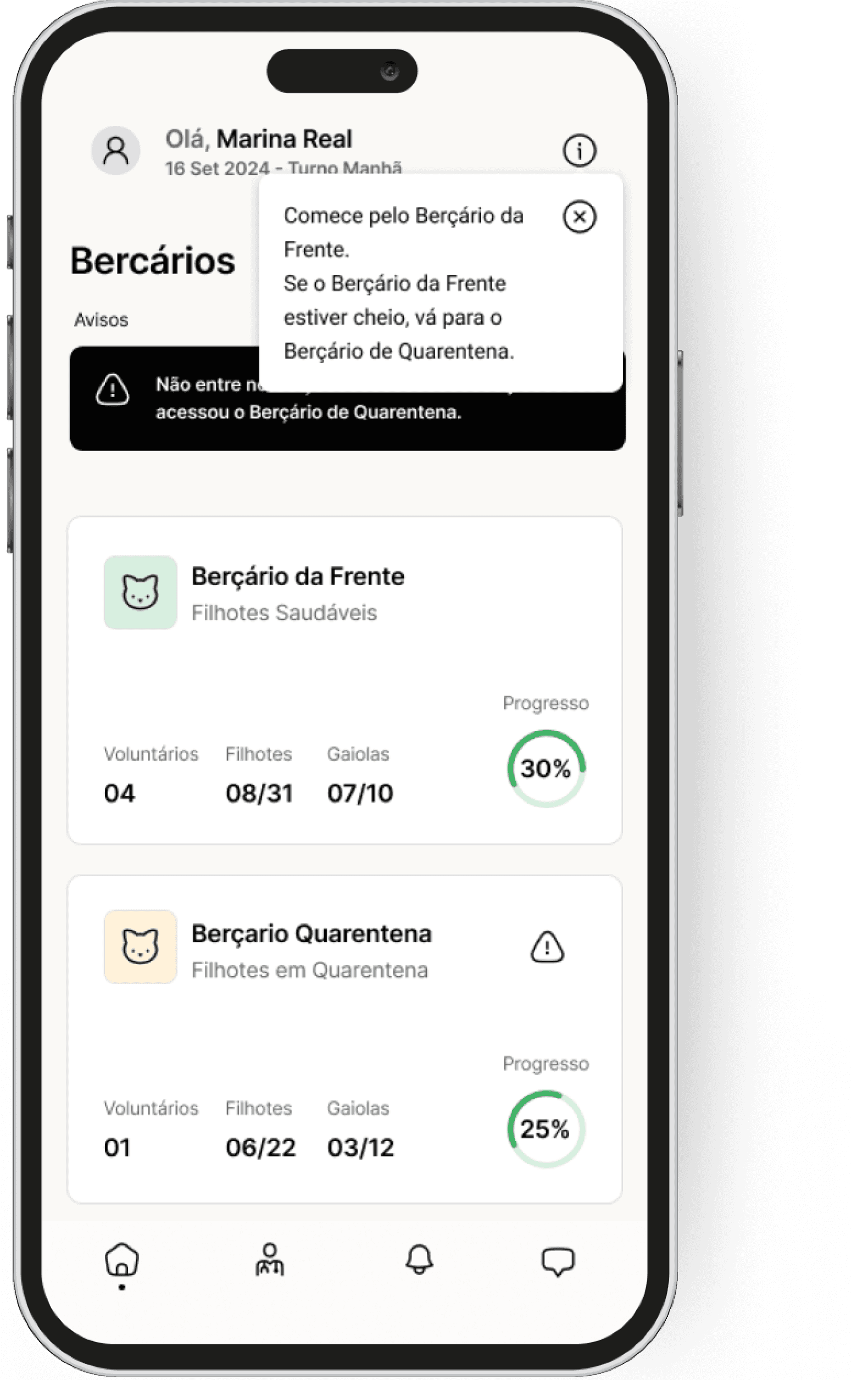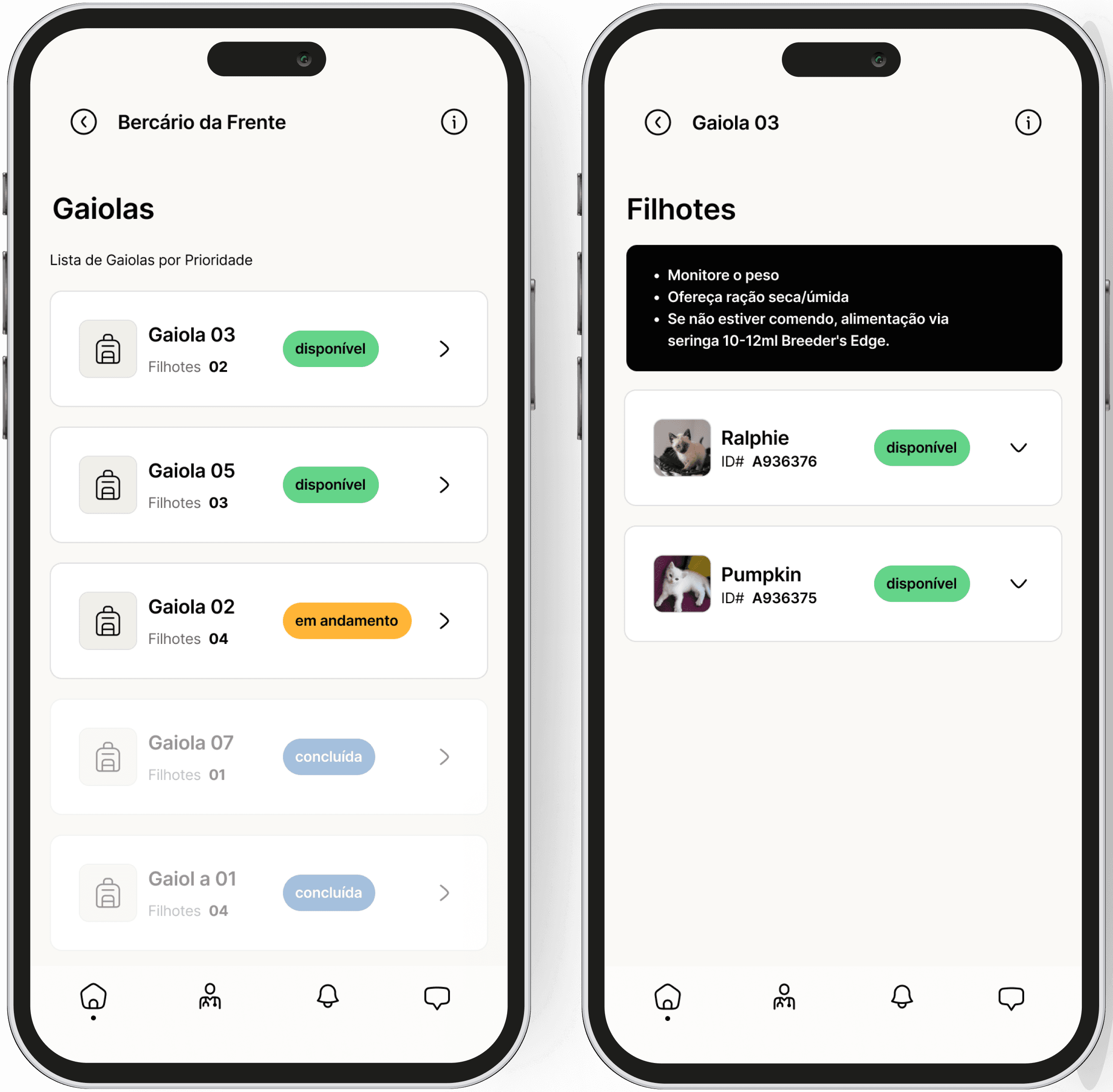 Os registros de saúde dos filhotes eram feitos manualmente, o que gerava confusão na identificação de quais já haviam sido atendidos, aumentava o risco de omissões nos cuidados e dificultava a alocação eficiente dos voluntários, por falta de visibilidade das necessidades específicas de cada berçário.