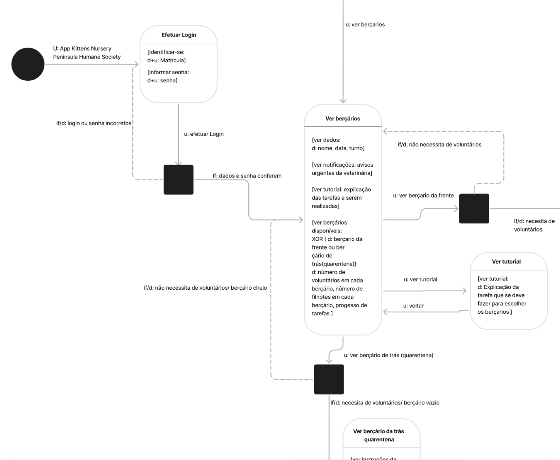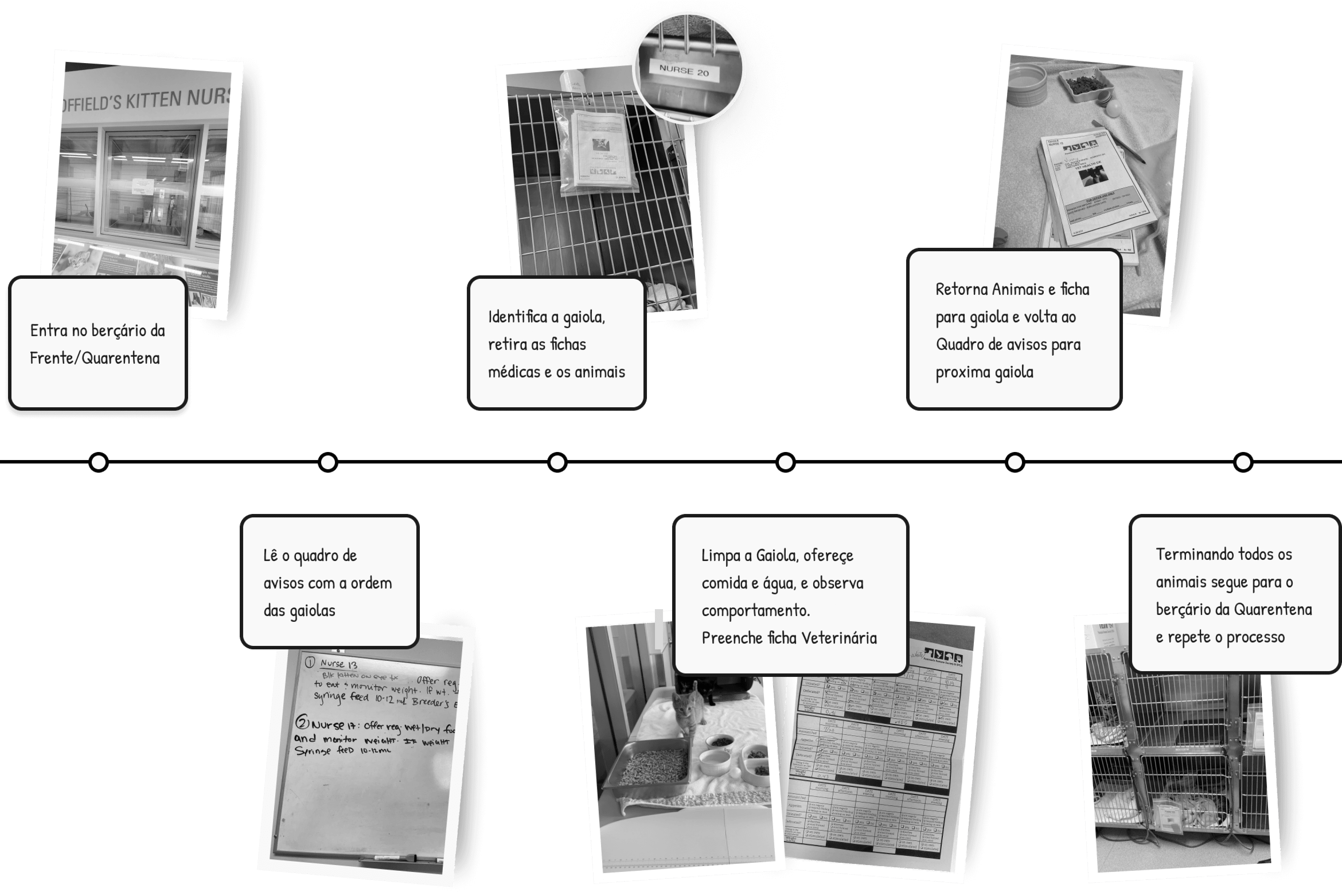 Ao observar a rotina dos voluntários, mapeei toda a jornada que realizavam, desde a chegada até o final de cada turno. Esse processo revelou etapas confusas, tarefas repetitivas e falhas na comunicação, que impactavam diretamente o cuidado com os animais.