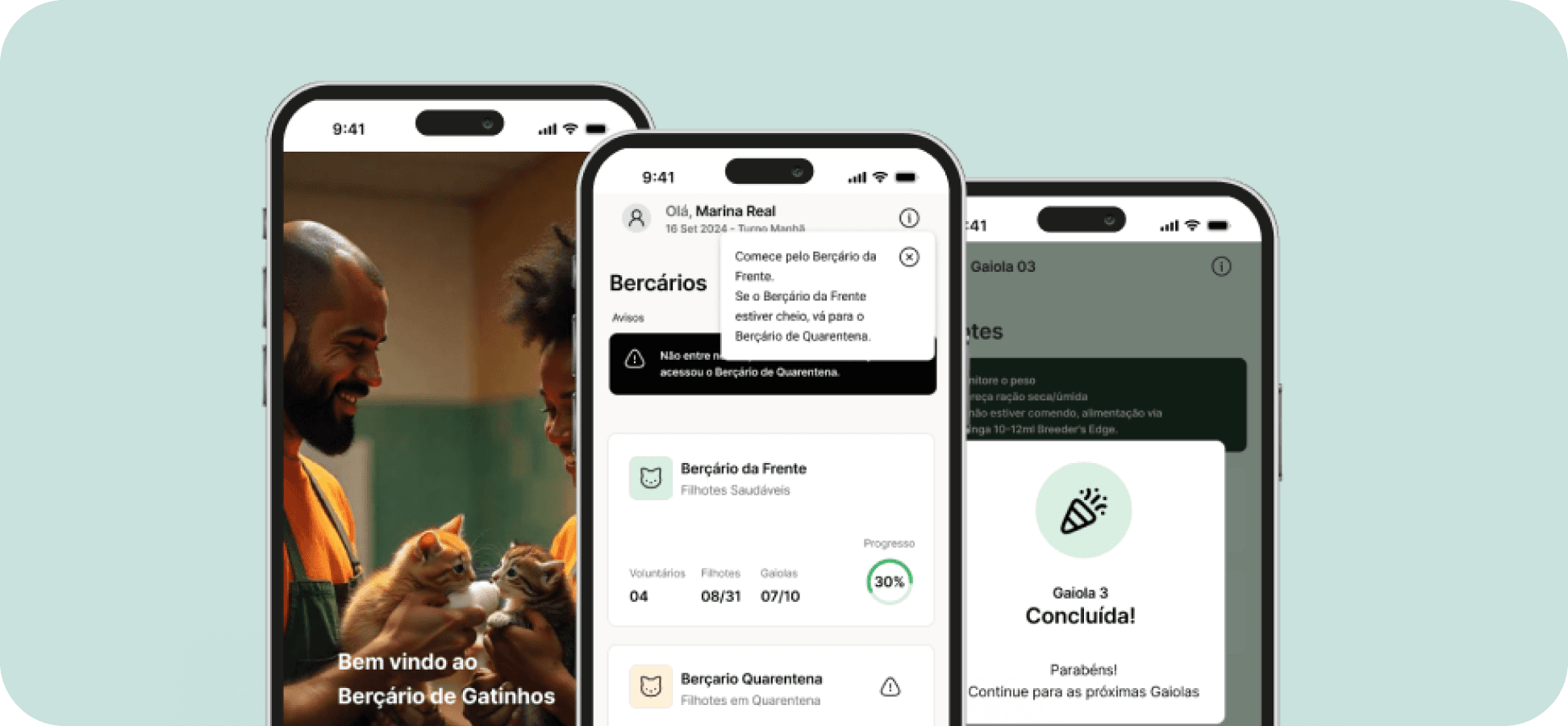 Desenvolvi um aplicativo mobile que automatiza o registro da saúde dos filhotes, organiza tarefas por prioridade e mostra em tempo real a distribuição de voluntários nos berçários. A solução inclui também um tutorial interativo que orienta novos voluntários passo a passo.