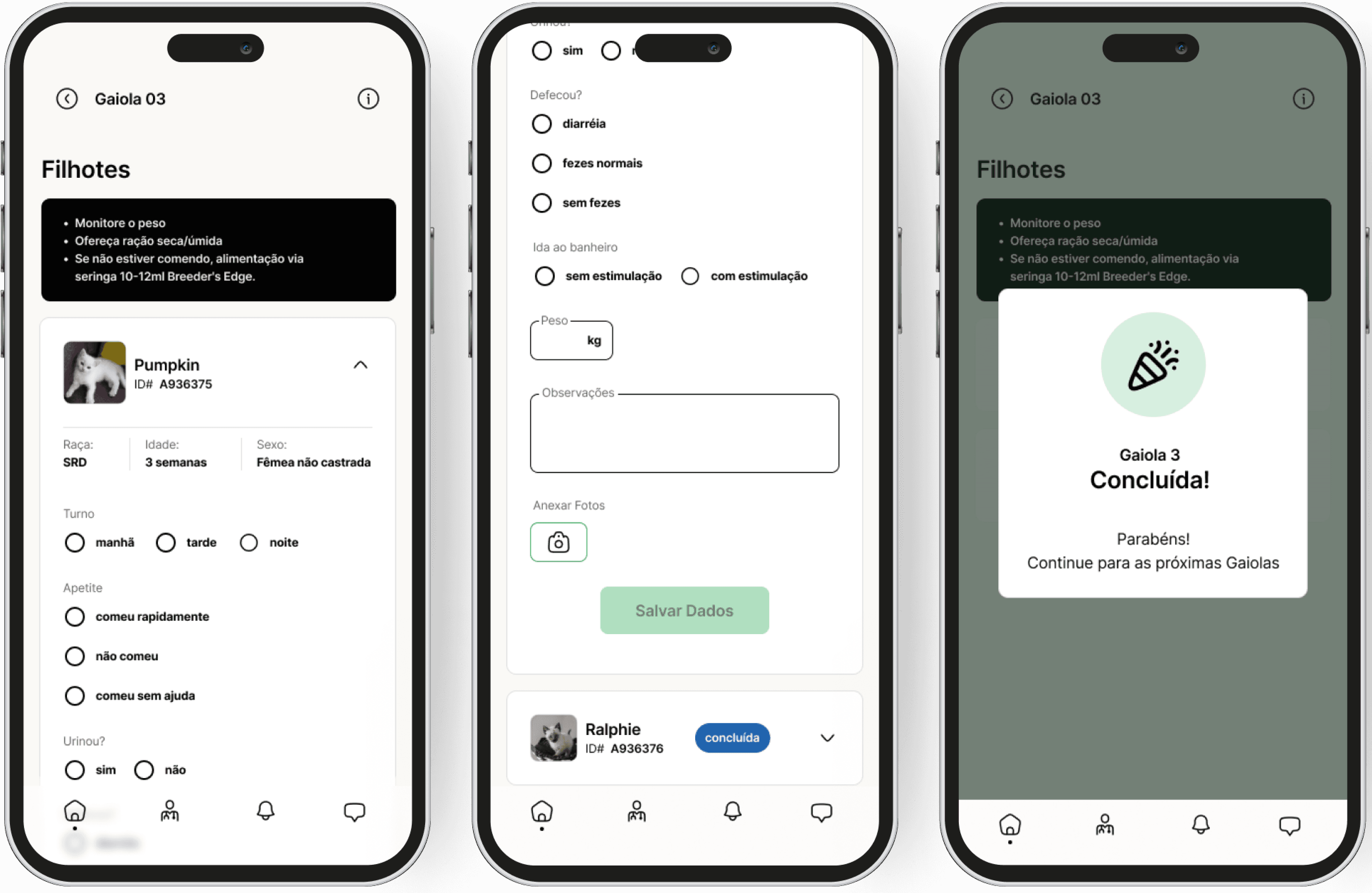 Quando o usuário finaliza o atendimento a todos os animais da gaiola, o sistema informa automaticamente que a gaiola foi concluída e direciona o usuário para a tela das gaiolas, permitindo que ele escolha outra gaiola para atender.