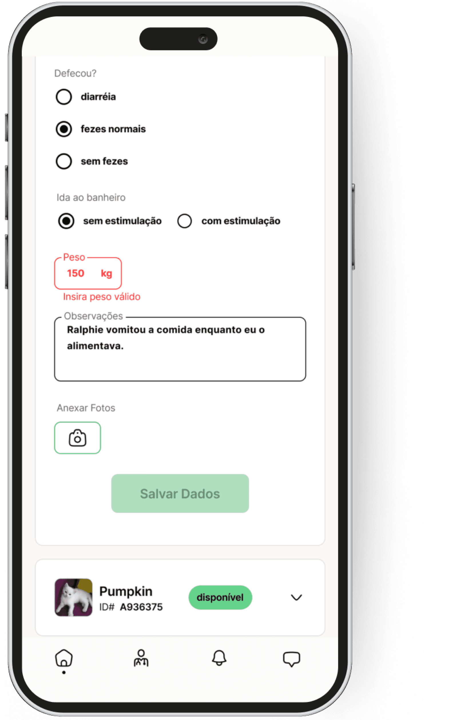 Tela com mensagens de erro que podem ocorrer durante a interação. Se o usuário preencher incorretamente o campo de peso do animal, uma mensagem em vermelho informará "Insira um peso válido", e o botão "Salvar" permanecerá desabilitado até que o erro seja corrigido.